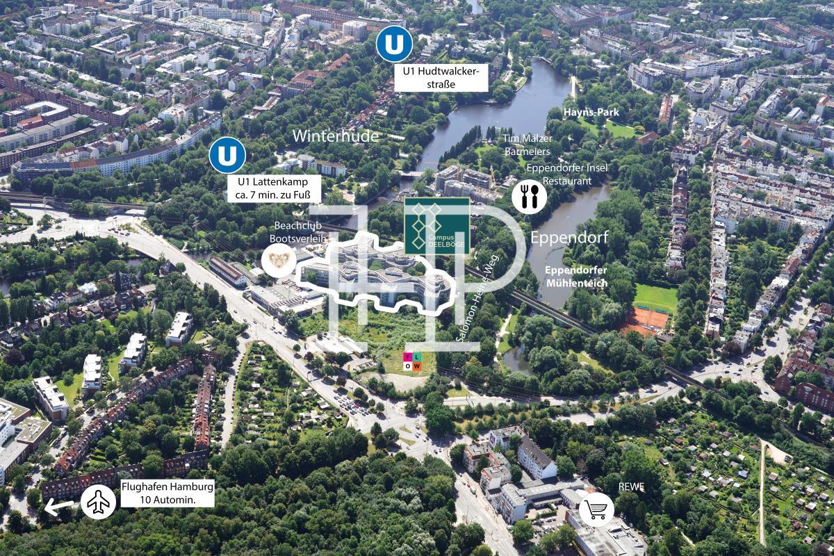 Das Objekt befindet sich im Stadtteil Eppendorf, direkt angrenzend an Winterhude und Alsterdorf. Von oben gesehen verlaufen entlang des Areals der Alsterkanal und der Eppendorfer Mühlenteich - auf einer Art "Halbinsel" mit viel Grünflächen liegt der Campus. Die Innenstadt erreichen Sie von hier in ca. 20 Autominuten (ca. 7 km). Der Winterhuder Marktplatz ist ca. 15 Gehminuten entfernt und bietet viele Restaurants und Möglichkeiten zum "Small Shopping".