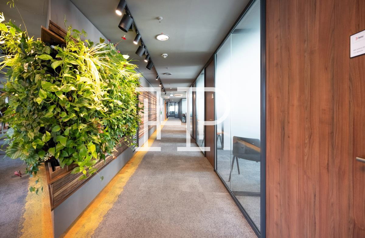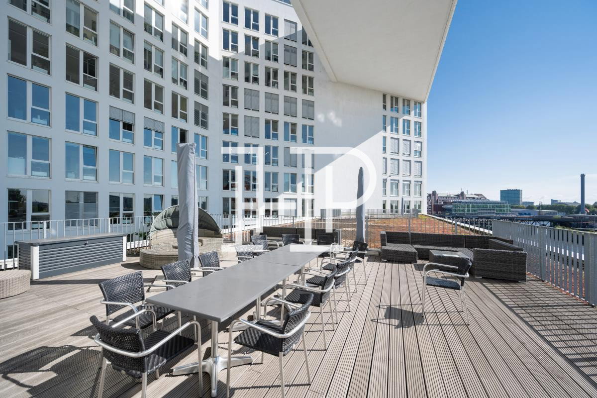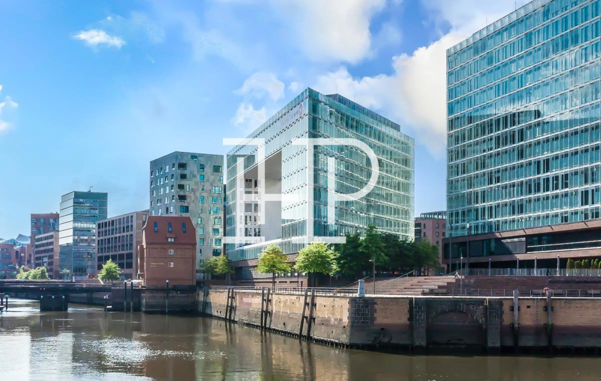 Büroflächen im Ericus Contor: markante Architektur mit Glasfassade, Blick auf Speicherstadt und HafenCity sowie begrünter Innenhof.