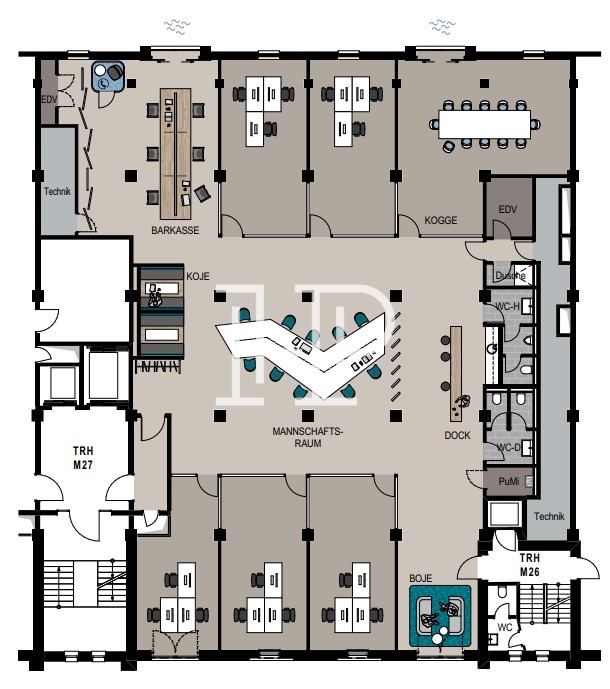 Der Speicher M27 wurde umfassend saniert und hochwertig ausgebaut. Er bietet Coworking-Flächen im dritten Obergeschoss. Das moderne Coworking-Café im Erdgeschoss lädt zu Pausen oder gemeinschaftlichem Arbeiten ein. Großzügige Dachterrassen bieten einen einzigartigen Ausblick auf die Elbphilharmonie und die Hamburger Innenstadt. Flexible Vertragslaufzeiten von 1 bis 2 Jahren sind möglich. Hier vereinen sich moderne Arbeitswelten und inspirierende Umgebung.